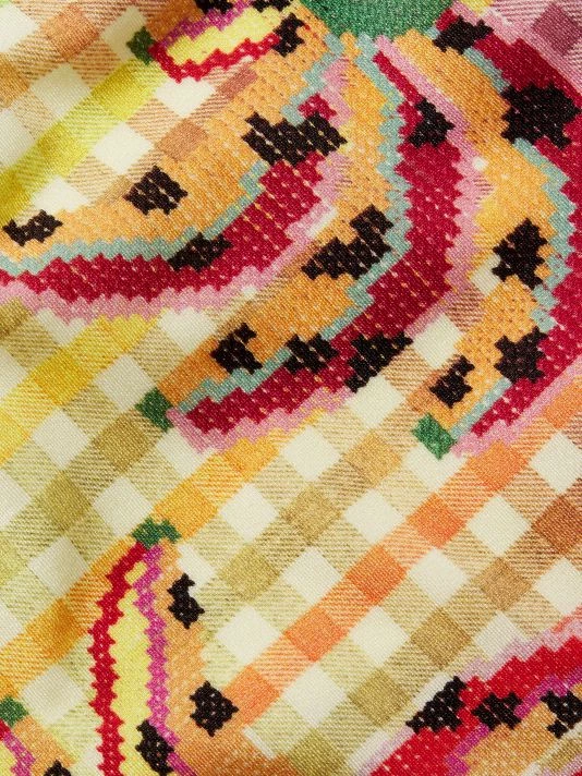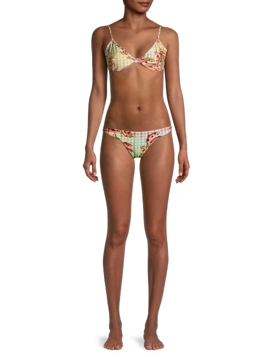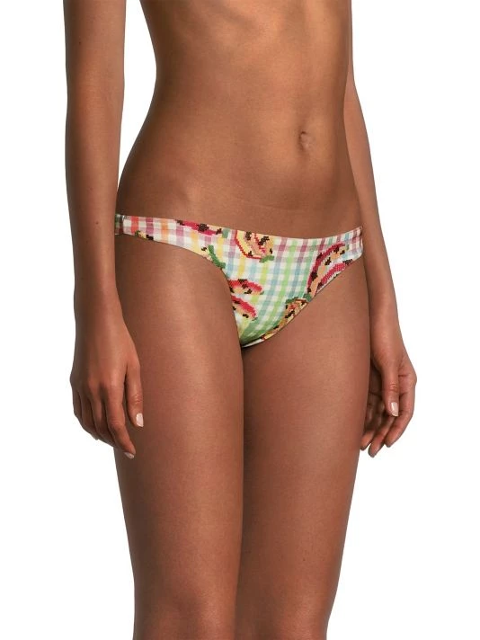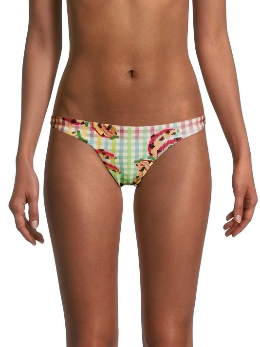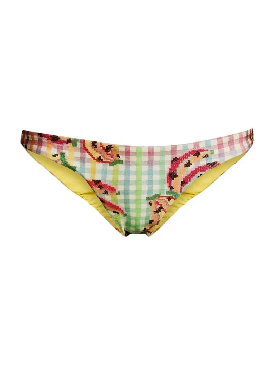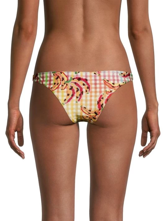 Farm Rio’s Banana Vichy bikini bottom features a bright banana-and-plaid print. High-cut legs and cheeky coverage define this playful style.
