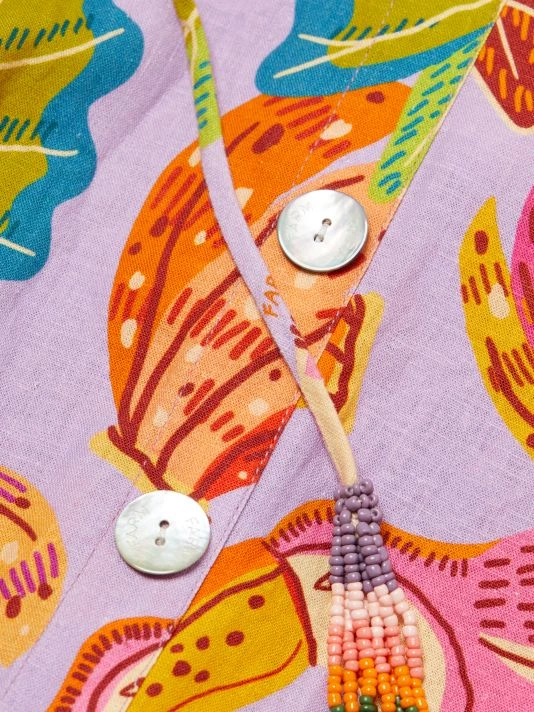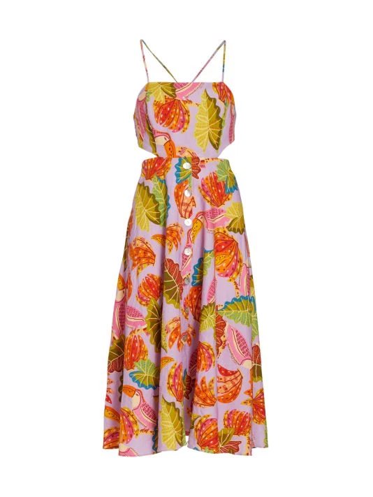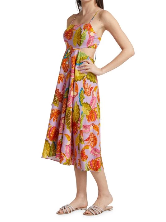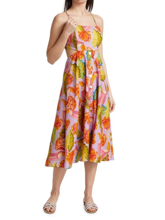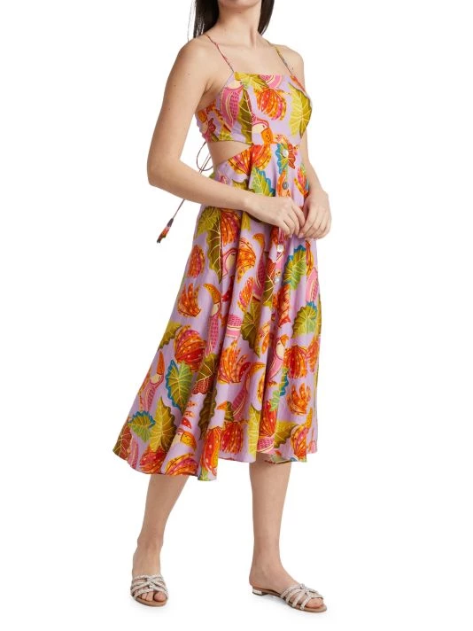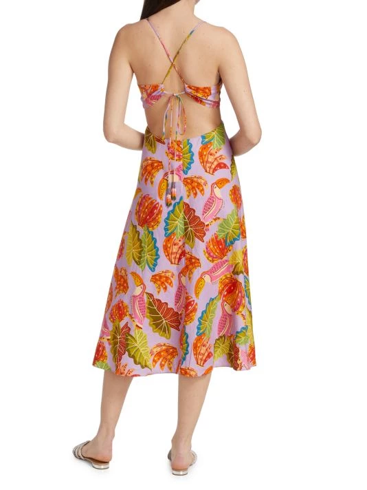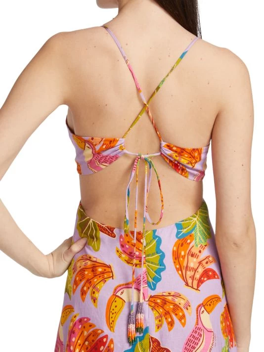 Flaunting a structured squareneck, Farm Rio’s Beaks & Bananas midi dress features crisscrossed, beaded tassels at the cut-out back.