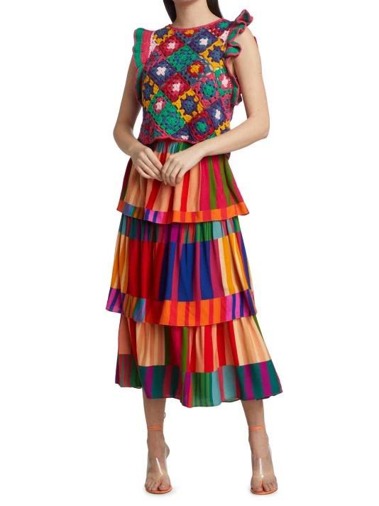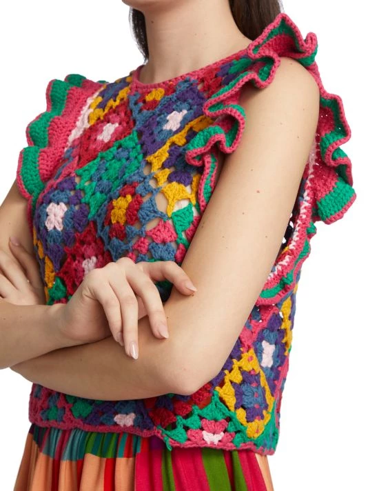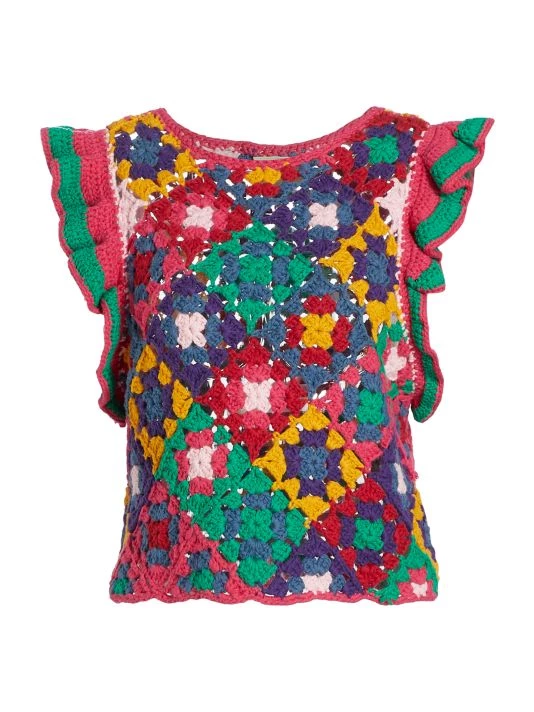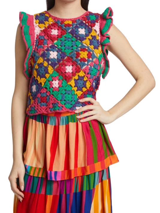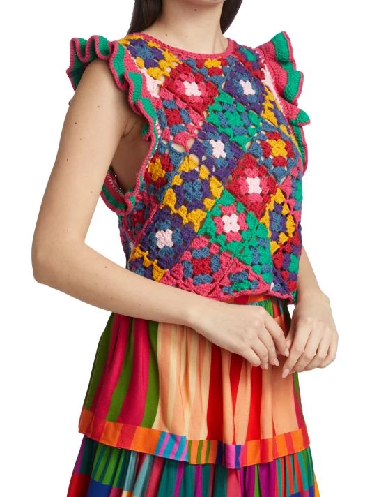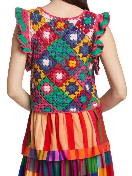 Farm Rio’s vest is crafted of multicolored crochet squares with flutter cap sleeves.