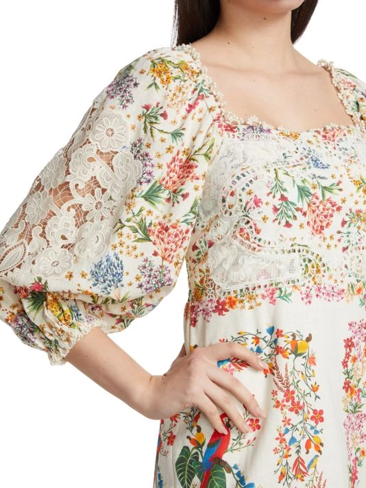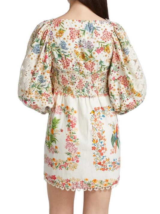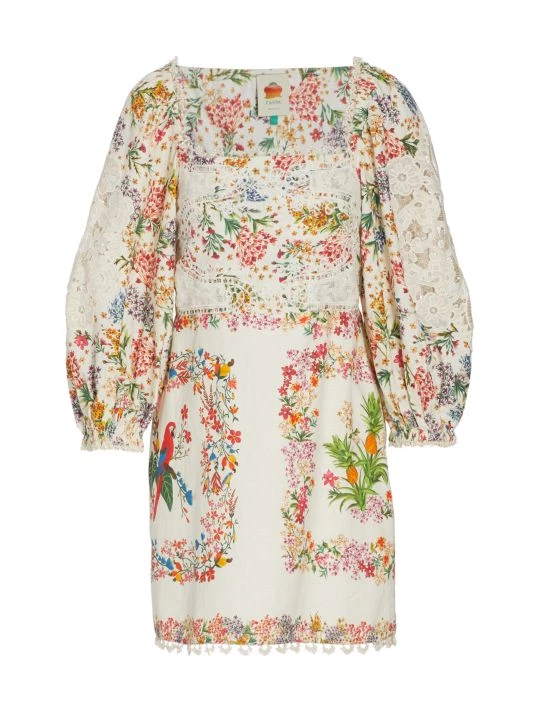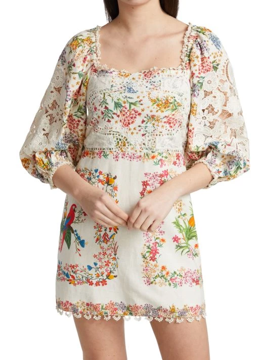 Designed with decorative embroidery, Farm Rio’s Delicate Forest Scarves minidress flaunts a structured squareneck. This piece is finished with voluminous billowy sleeves.