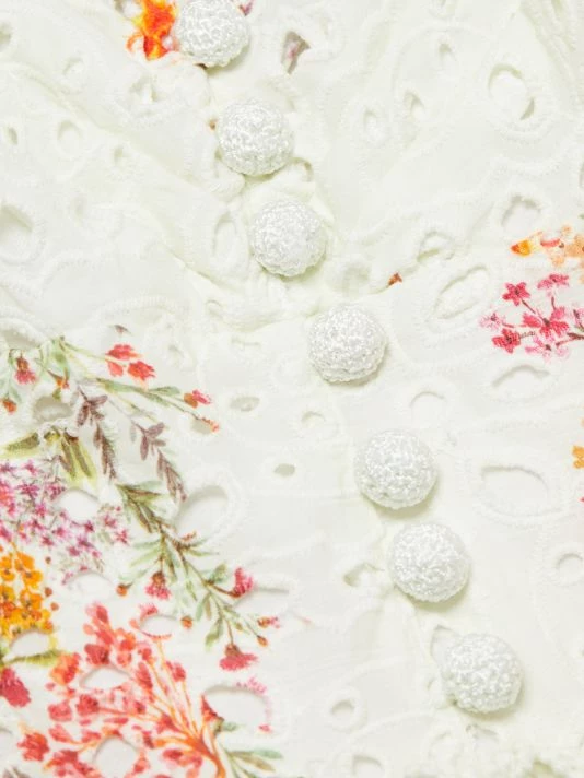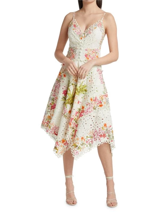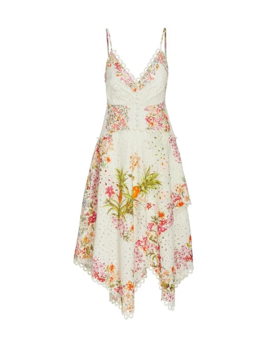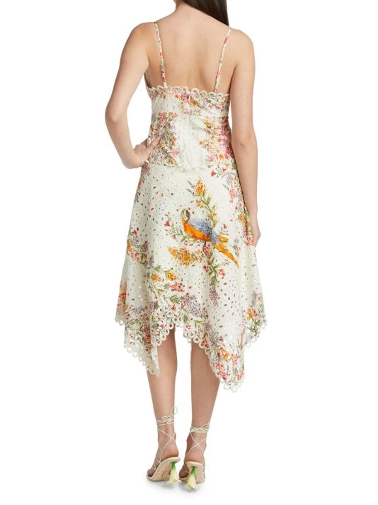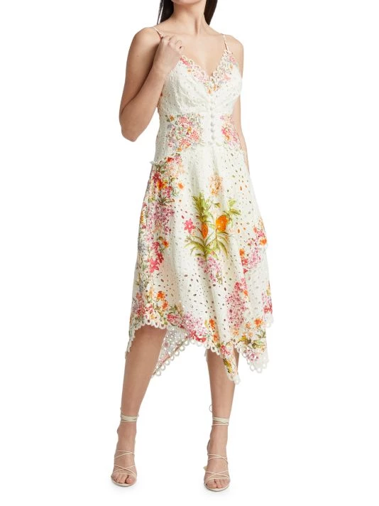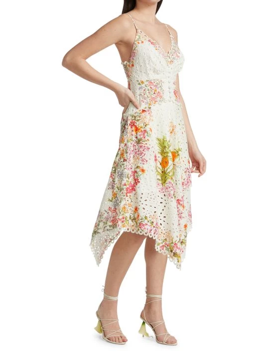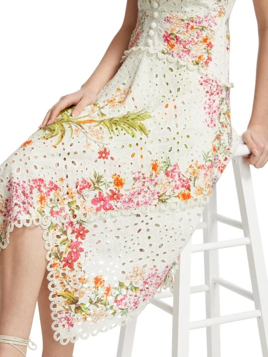 Crafted of cotton, Farm Rio’s Delicate Forest Scarves midi-dress is styled with a tiered handkerchief hemline, eyelet embroidery, and scalloped trim on the neckline, waist, and hem.