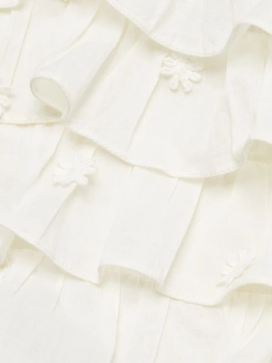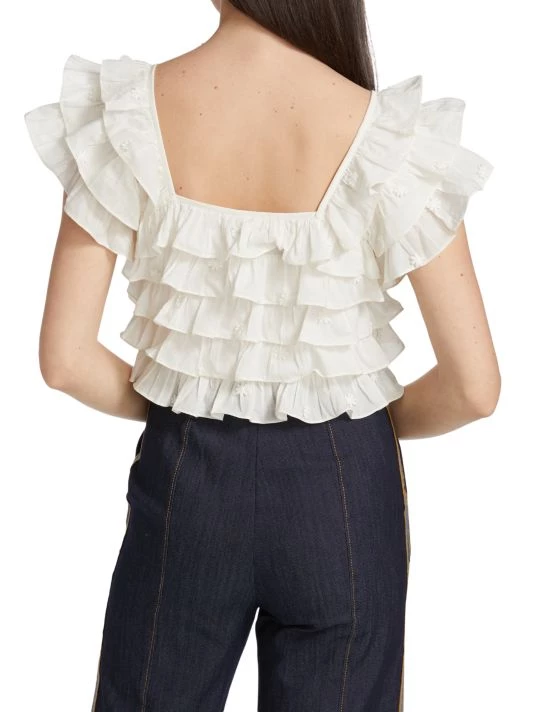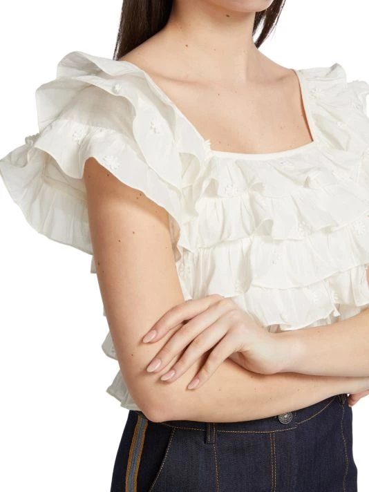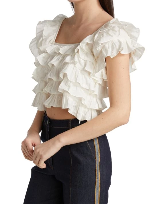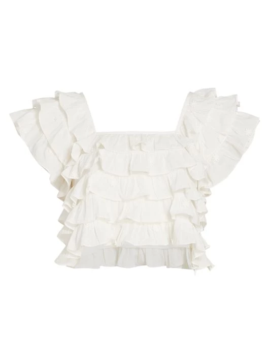 Farm Rio designs everyday wear with a fun and playful feel. Made of cotton, this blouse from the Brazilian label is detailed with layered ruffles boasting floral embroidery.
