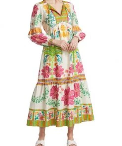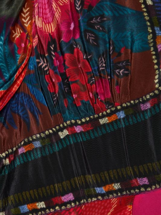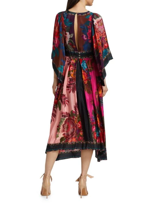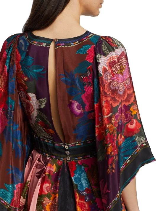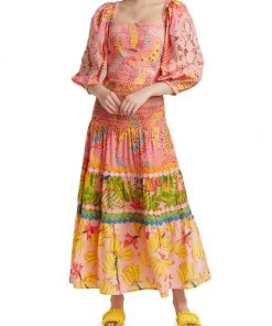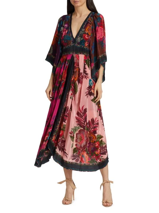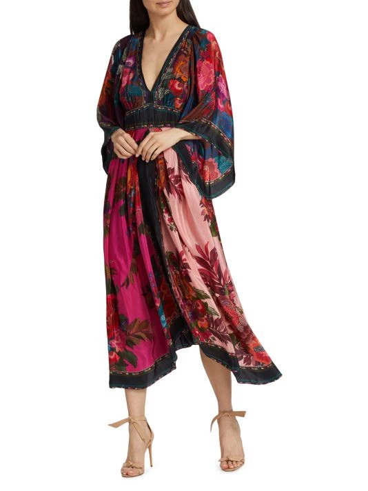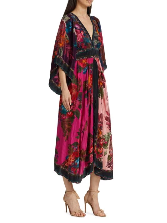 Designed with pieced prints, Farm Rio’s Flower Scarves maxi dress features a relaxed, drapey silhouette.