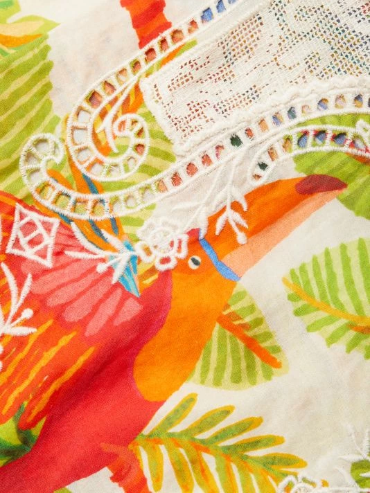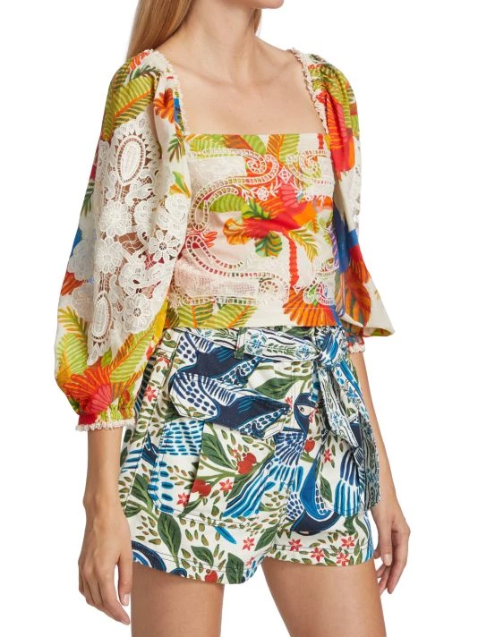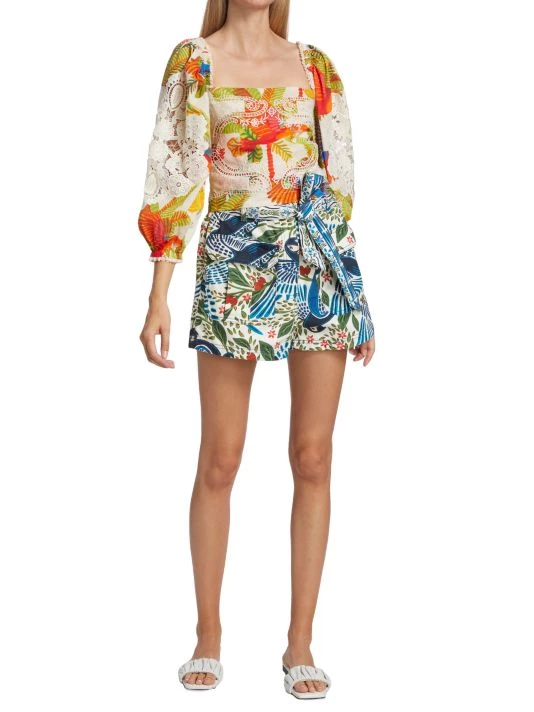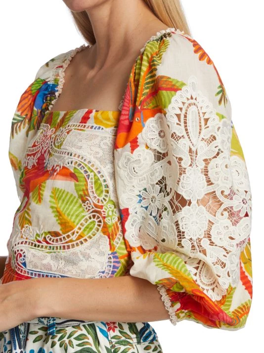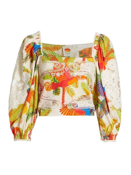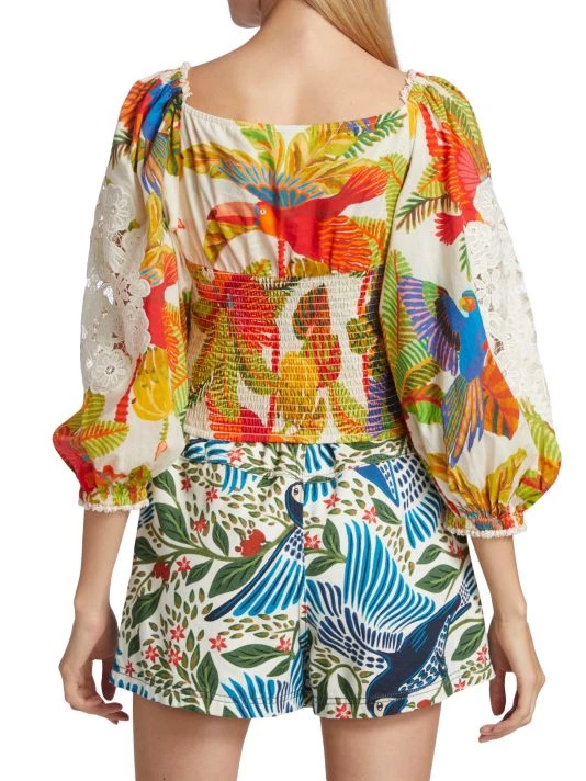 Intricate embroidery embellishes this vibrant top, designed with dramatic puff sleeves.