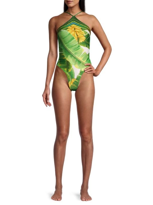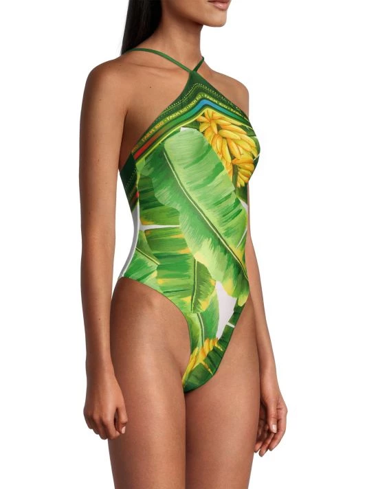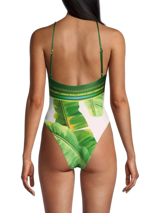 ONLY AT SAKS. The Fresh Foreset one-piece swimsuit from Farm Rio features a halterneck and low back with adjustable straps. A lush botanical print completes this high-cut style.