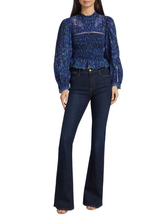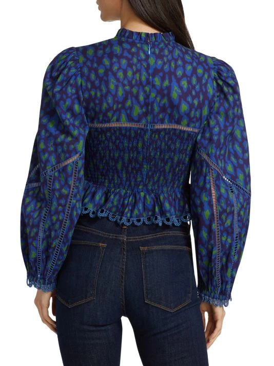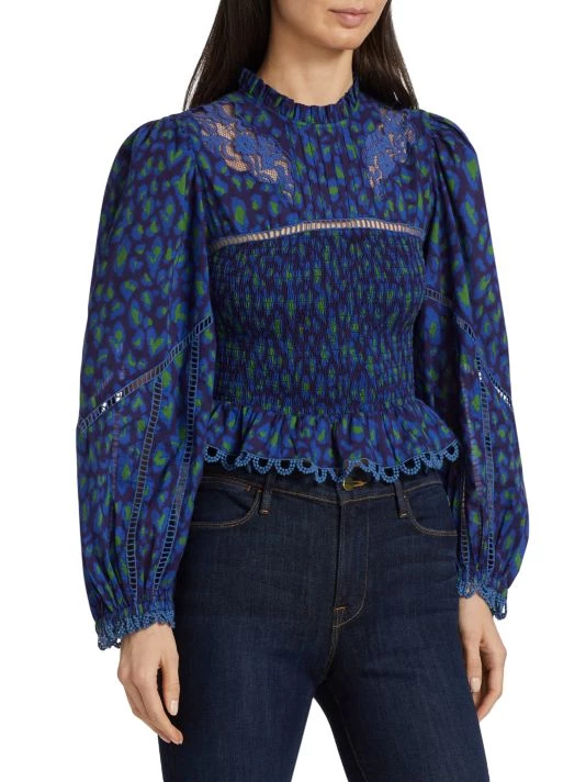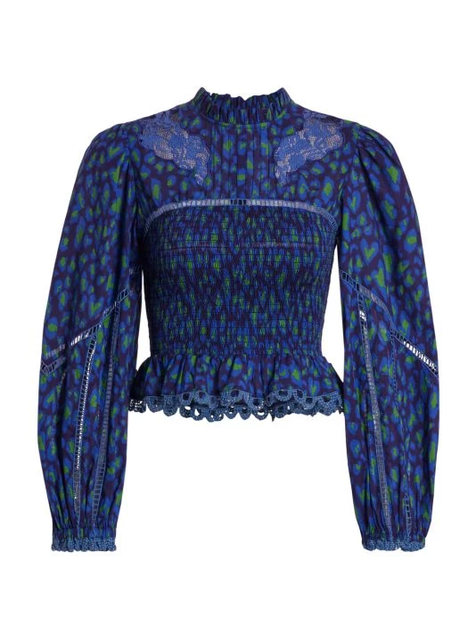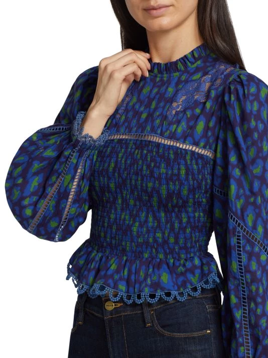 Smocking shapes the bodice of Farm Rio’s Leopard Pop blouse, designed with inset lace detailing and ruffle trim.