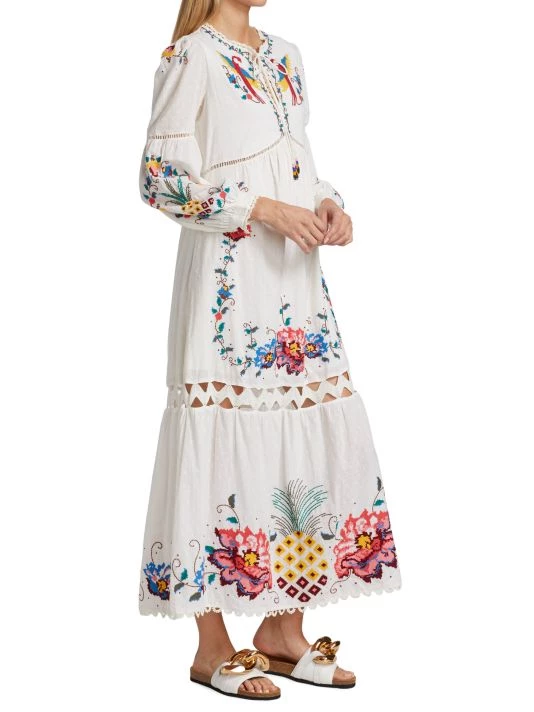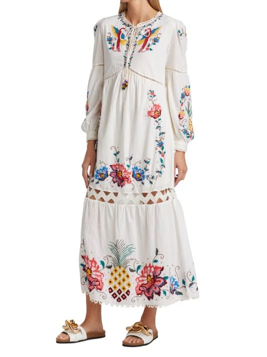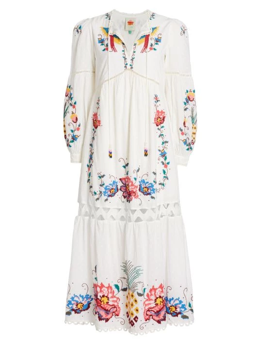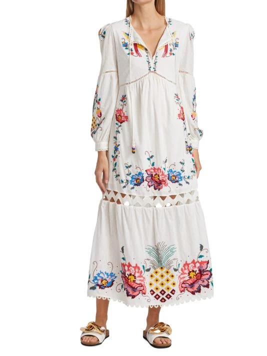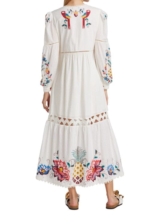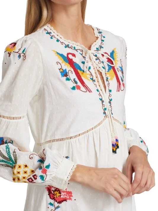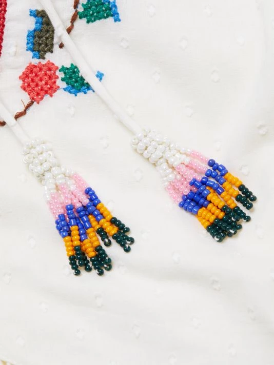 Crafted of textured cotton, Farm Rio’s Macaw dress is decorated with vivid cross-stitch embroidery. This breezy piece features geometric lace detailing, and a beaded fringe drawstring closure at the neck.