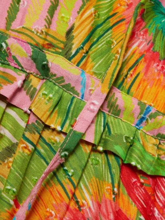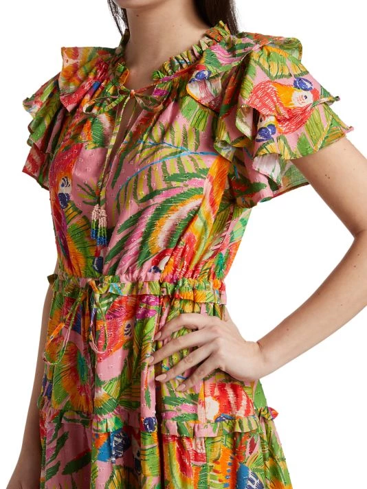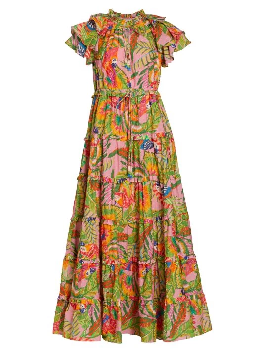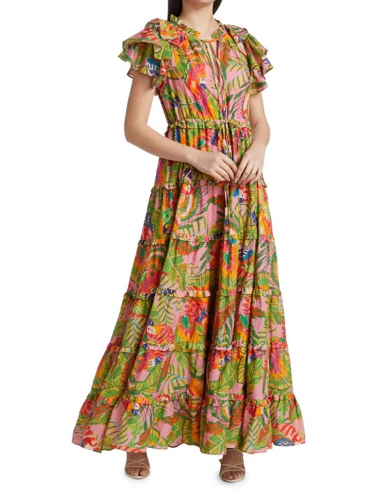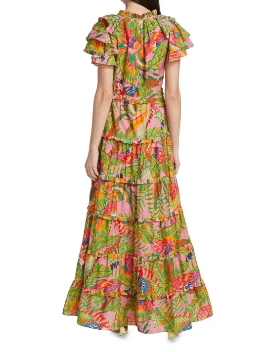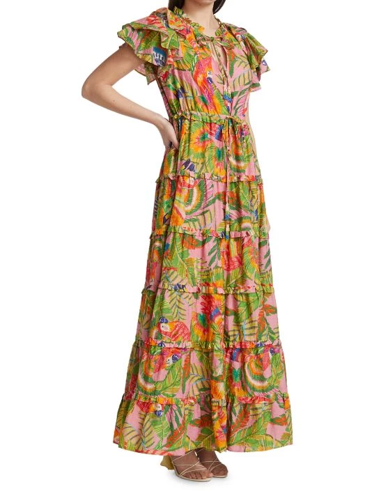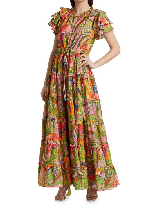 A vibrant tropical-inspired print covers this Macaw Leaves maxi dress, designed by Farm Rio. The dress features layered flutter sleeves and a tiered silhouette with ruffle embellishments.