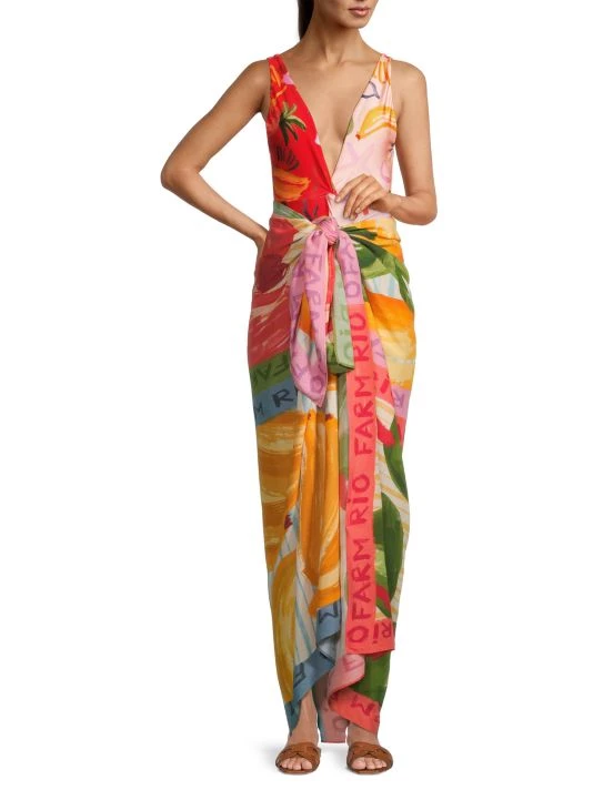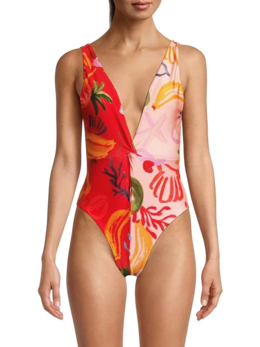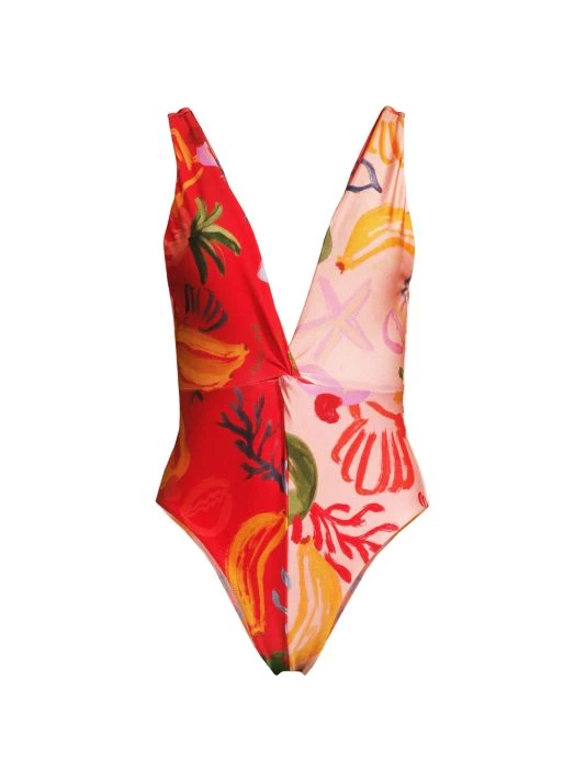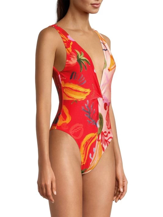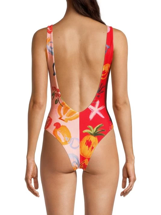 ONLY AT SAKS. This high-cut one-piece swimsuit from Brazilian label Farm Rio features a plunging V-neck with a subtle twist detail and an open back. A bright two-tone fruit print completes the look.