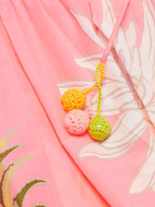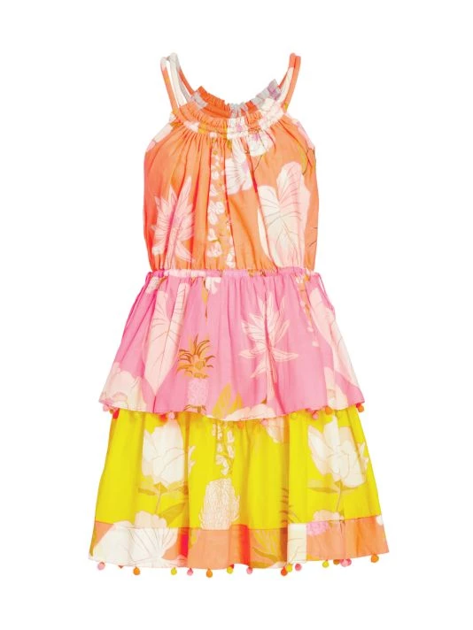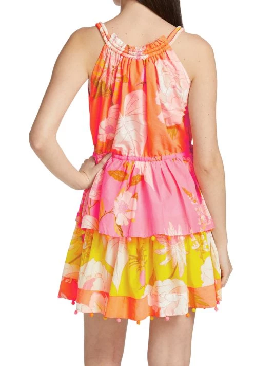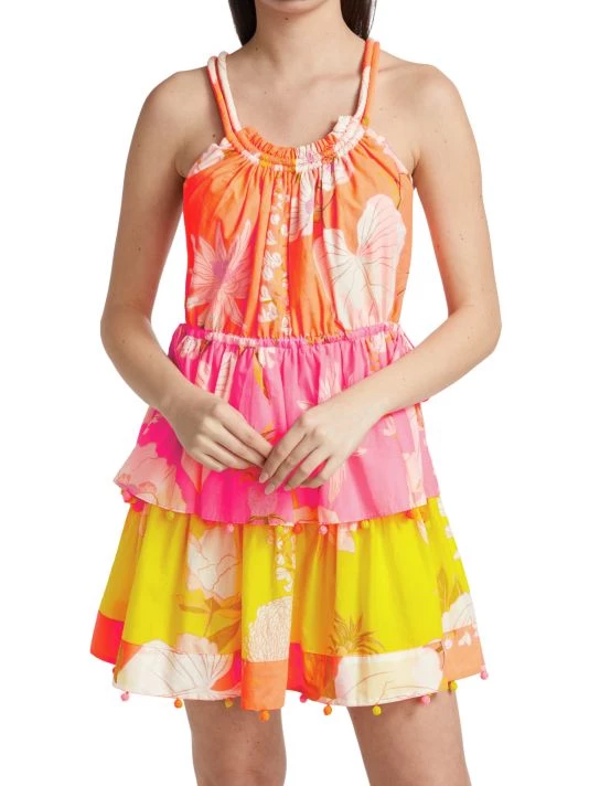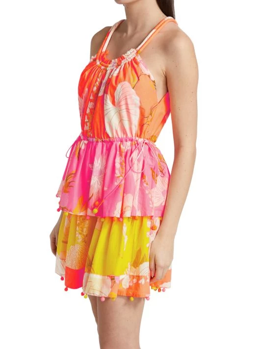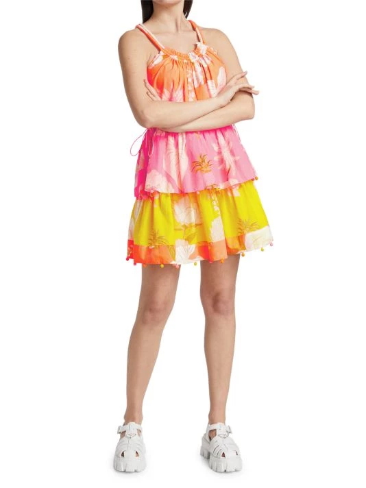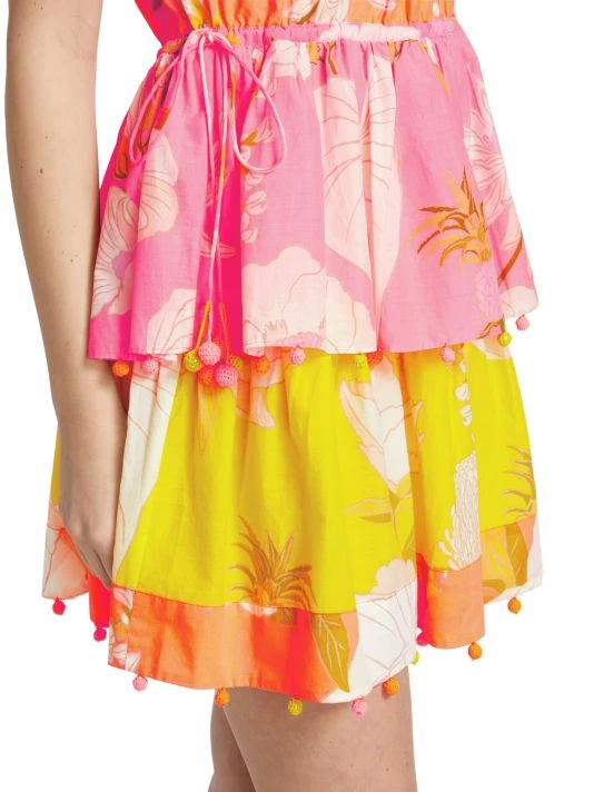Farm Rio’s Mixed Neon Garden minidress features a tiered skirt with pom-pom trim.
