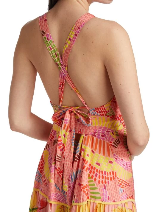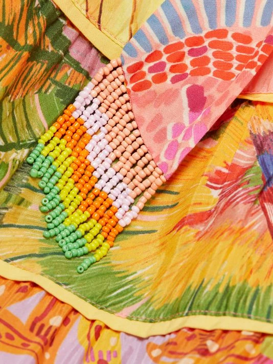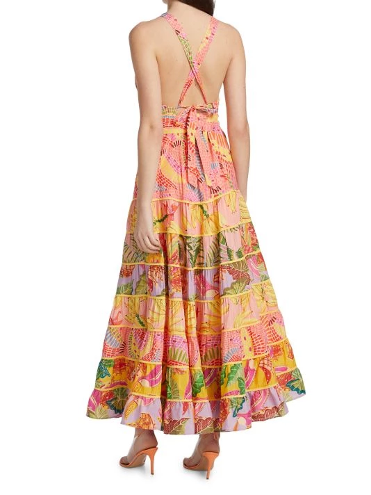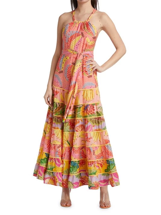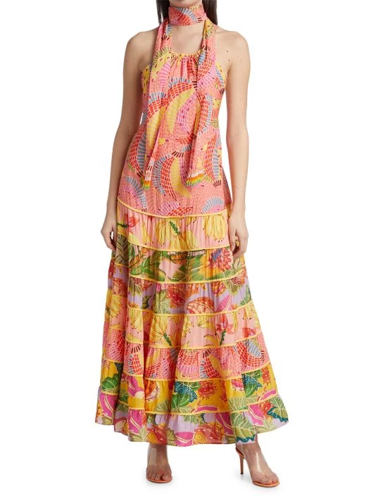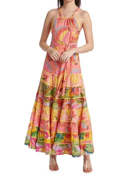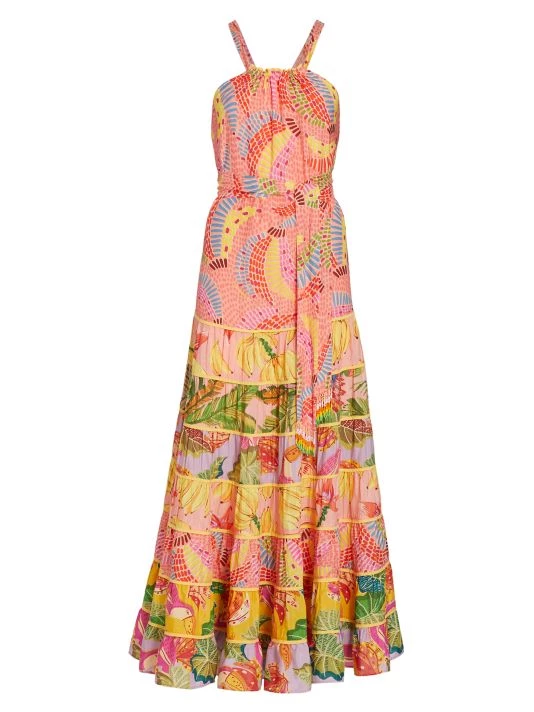 Featuring tiers of contrasting tropical mixed prints, this cotton maxi dress from Farm Rio is detailed with a versatile fringed sash belt.