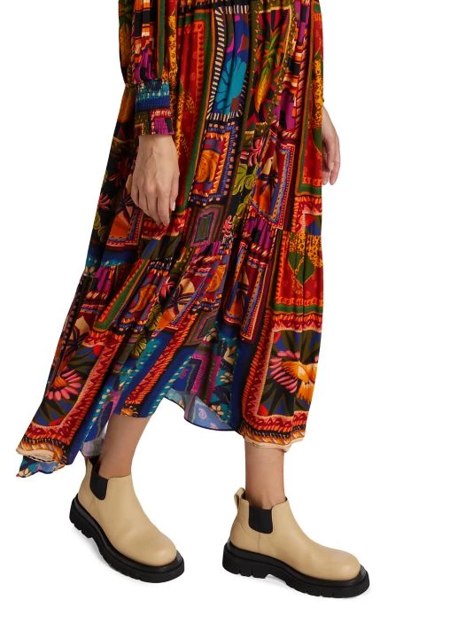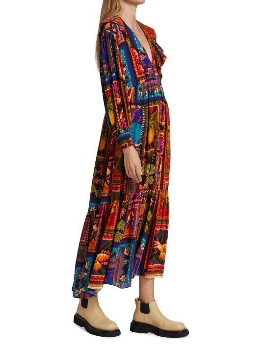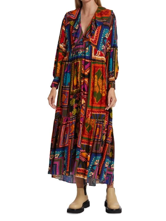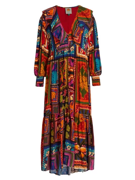 This button-front ankle dress features a ruffled neckline and bold print inspired by the vibrant colors and culture of Farm Rio’s home city, Rio de Janeiro.