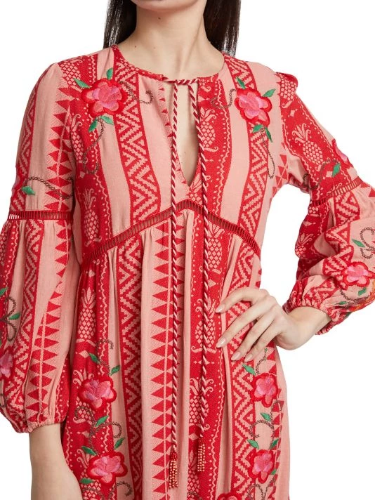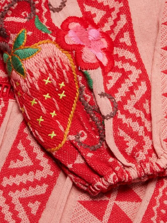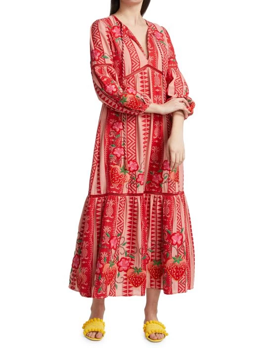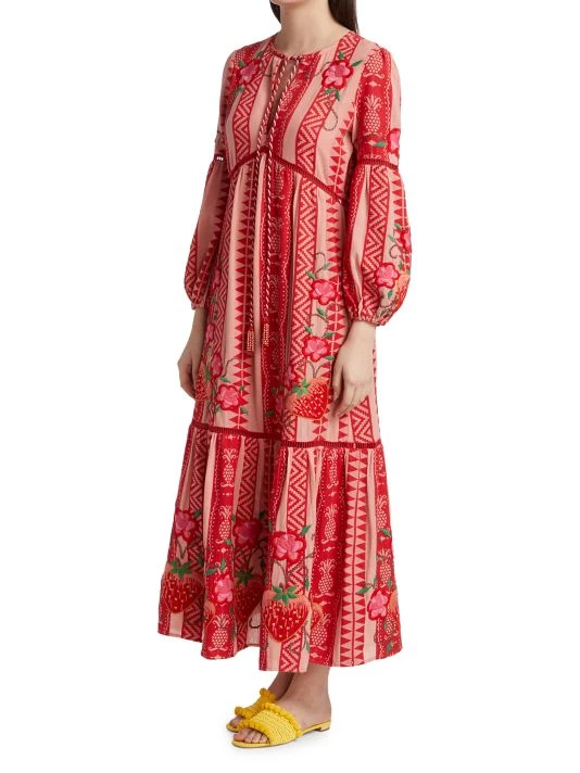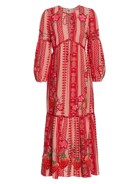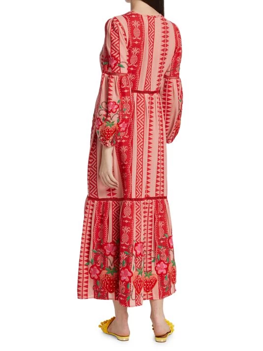 Crafted of jacquard cotton and showcasing a geometric pattern, the maxi dress from Farm Rio is detailed with an oversize pineapple embroidery and skin-baring ladder stitching.