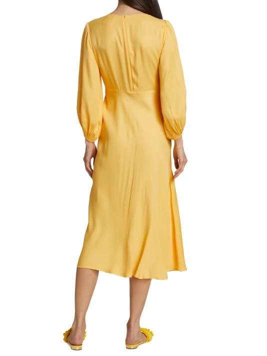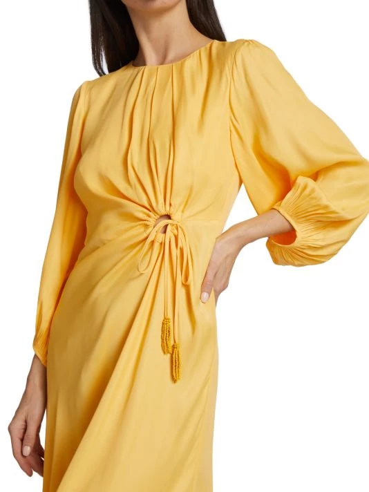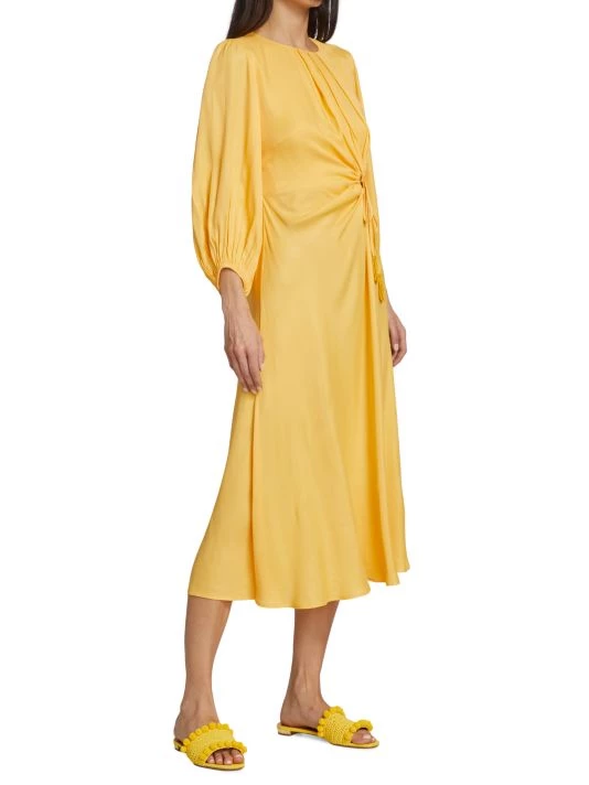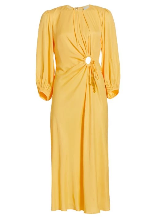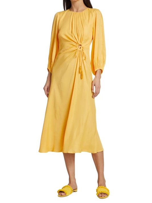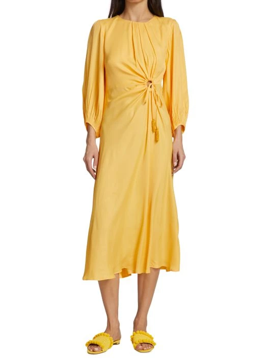 Farm Rio’s Piping midi-dress is styled with a waist-defining circular drawstring cut-out. A pleated neckline and asymmetric draping detail finish the look.