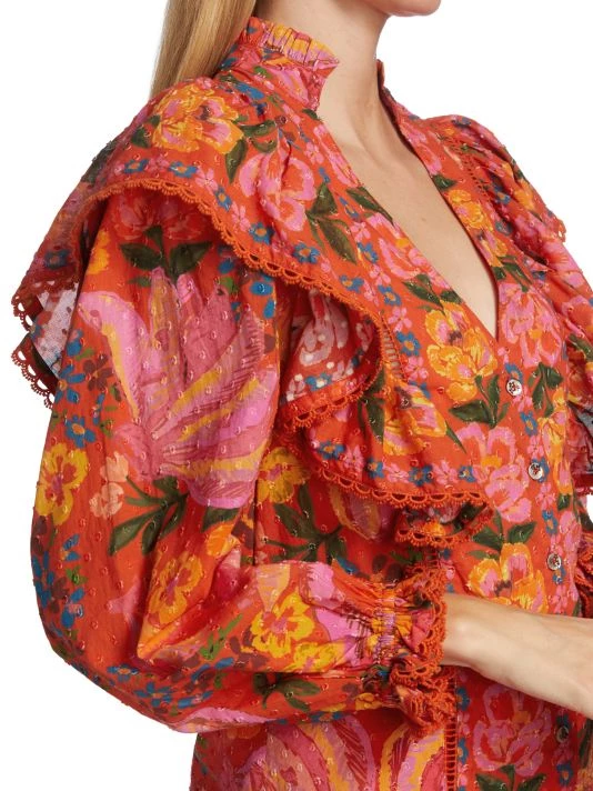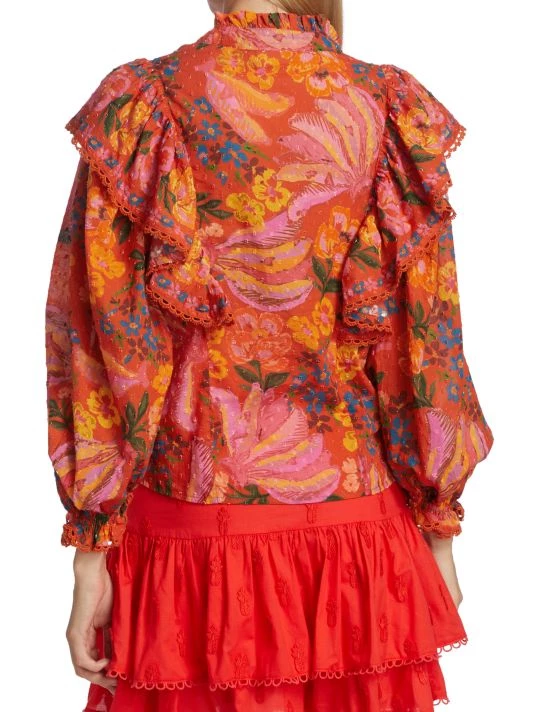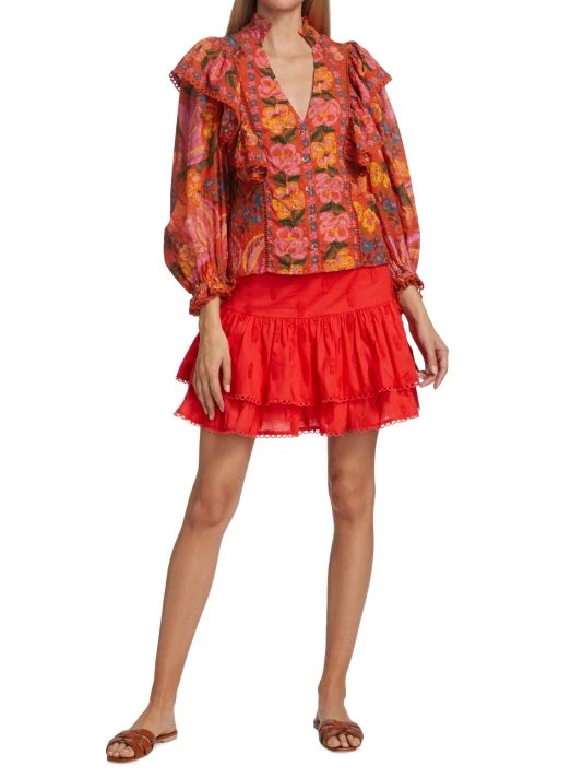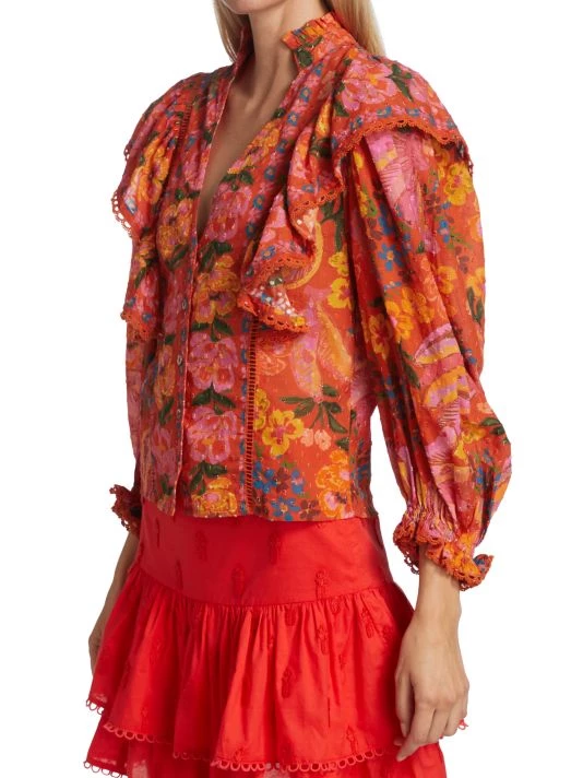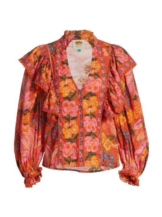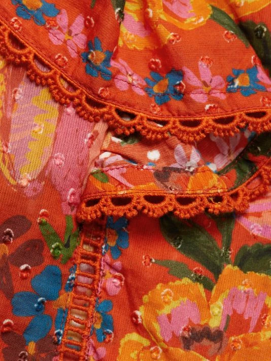 Crafted from lightweight cotton, this top features vibrant floral print and ruffled crochet trim.