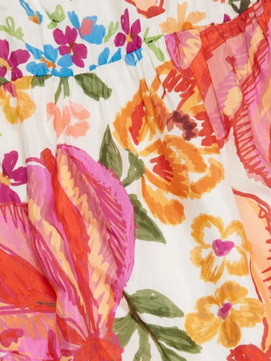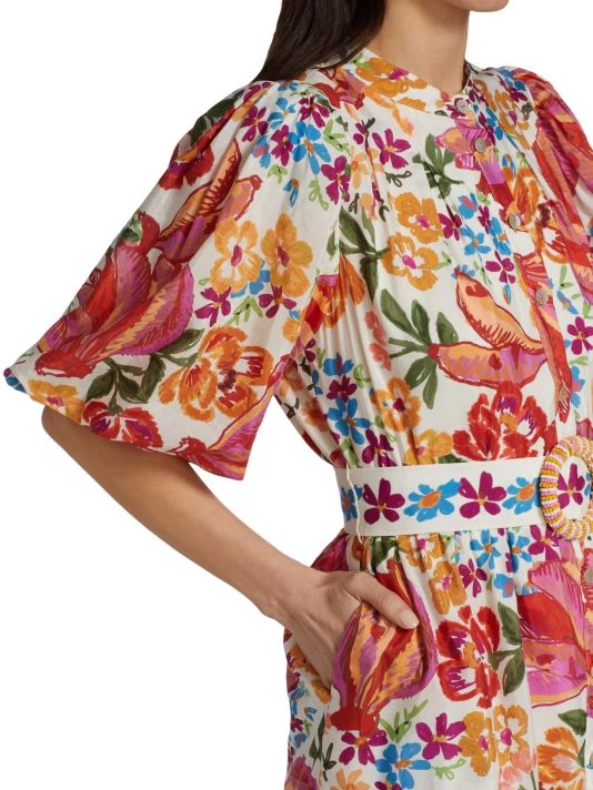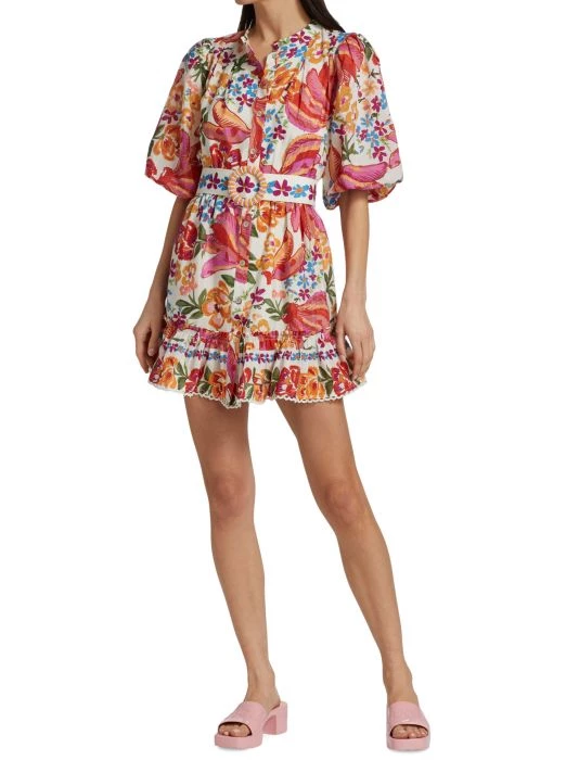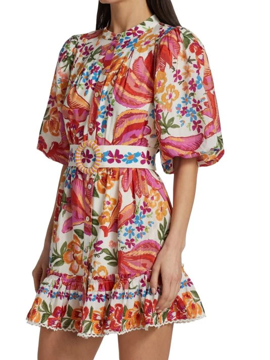 Adorned with a playful banana and floral motif, Farm Rio’s minidress features a button-front closure. This vivid piece is complete with three-quarter-length puff sleeves, a belt with a bead-embellished buckle, and a ruffled hem with lace detailing..