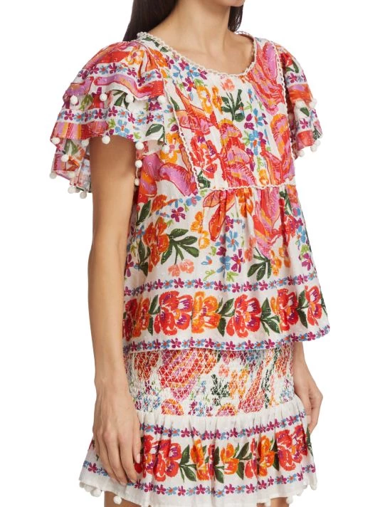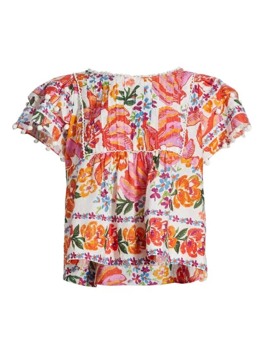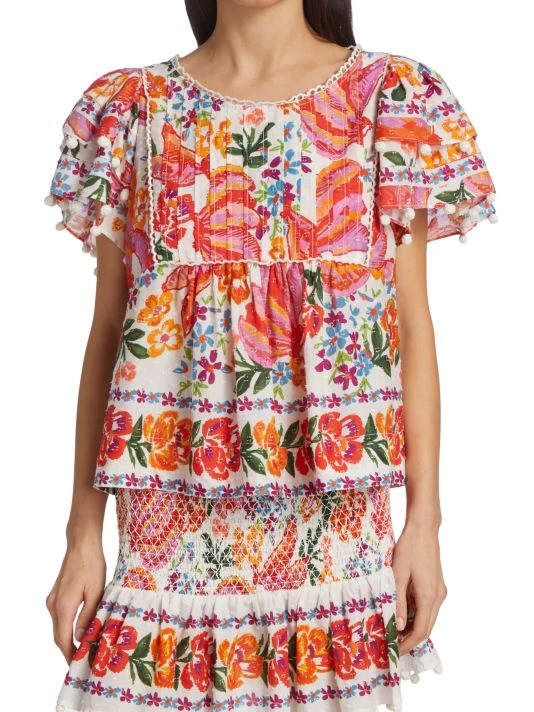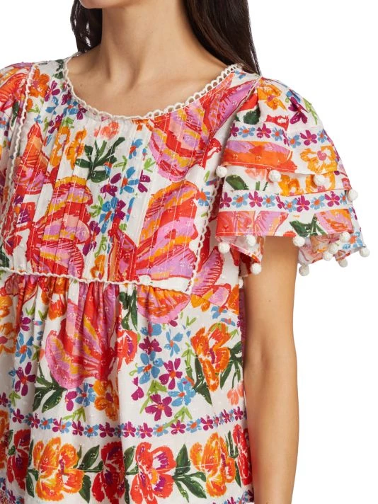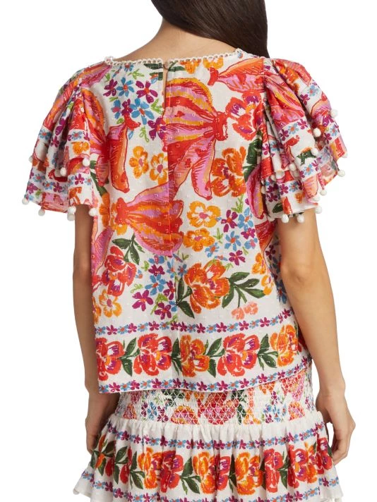 This bright Farm Rio cotton blouse features pintuck detailing and ruffled short sleeves finished with pom pom trim.