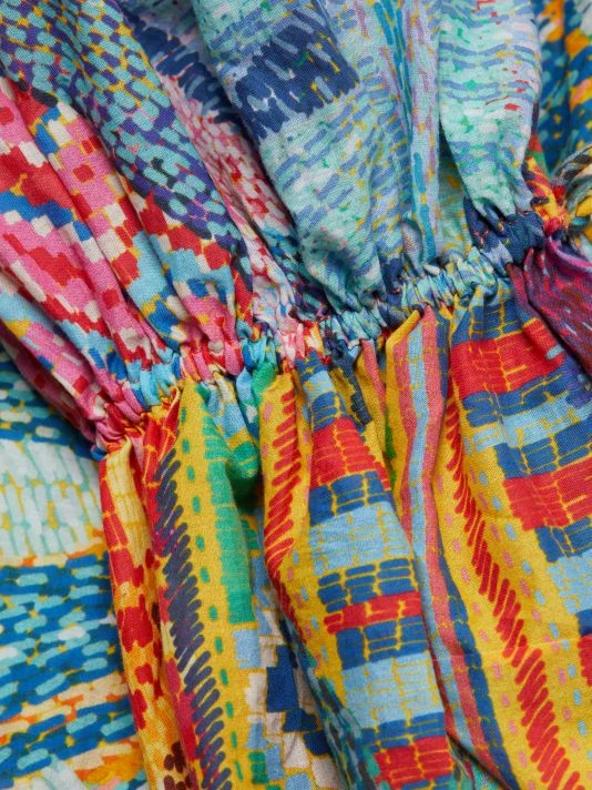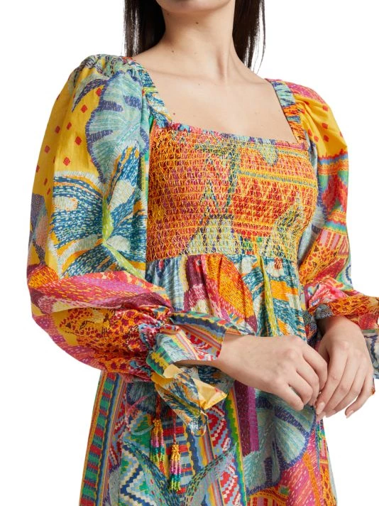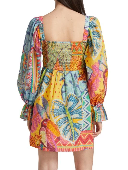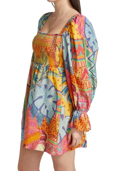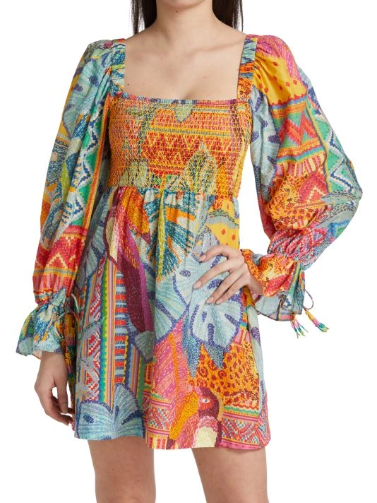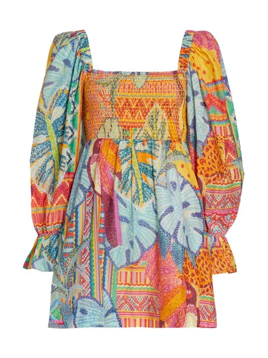 Crafted of tropical-printed cotton, the Summer Tapestry minidress from Farm Rio is styled with a square neck, smocked bodice, and blouson sleeves.