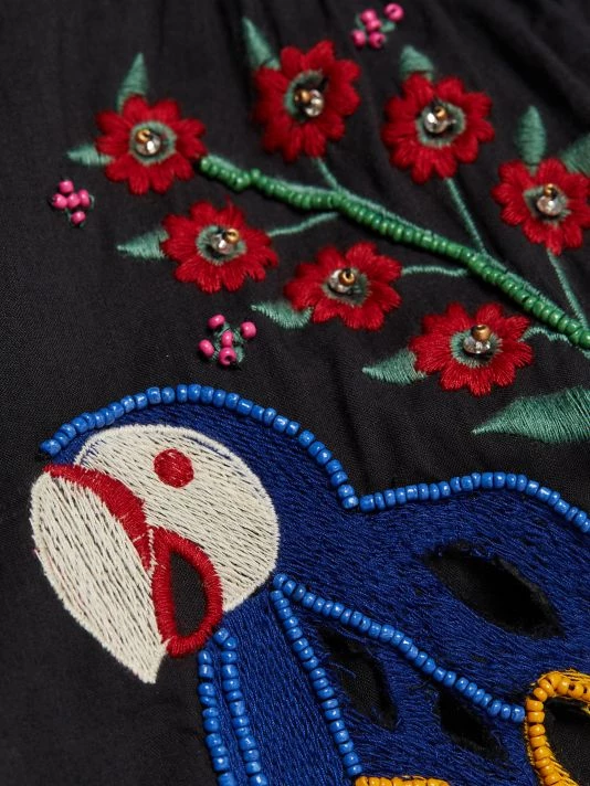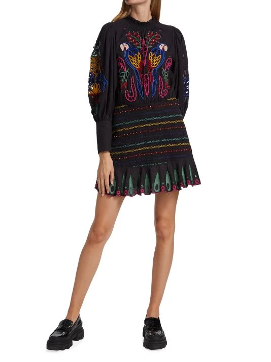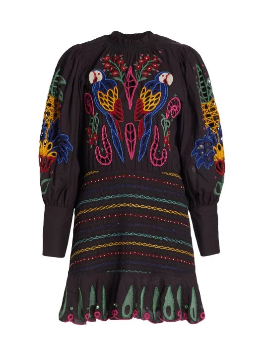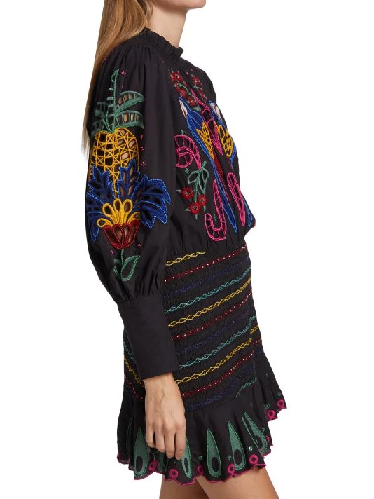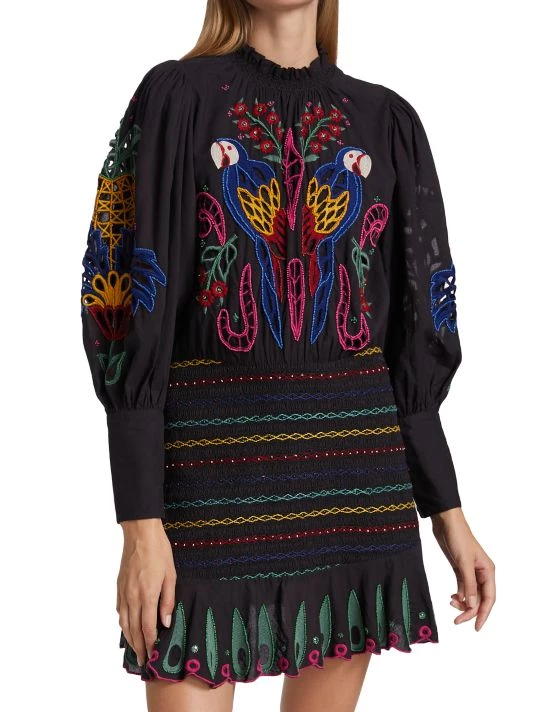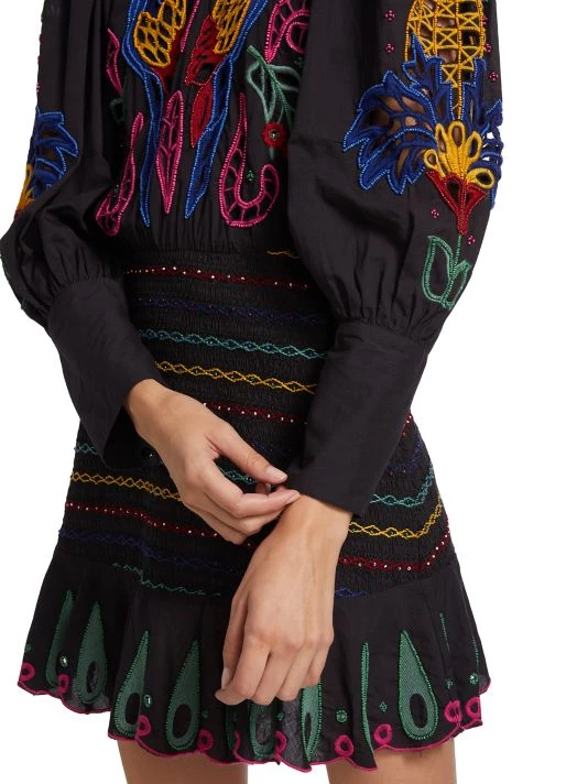 Lightweight cotton minidress embroidered with bright designs, smocked at the waist for a flattering fit.
