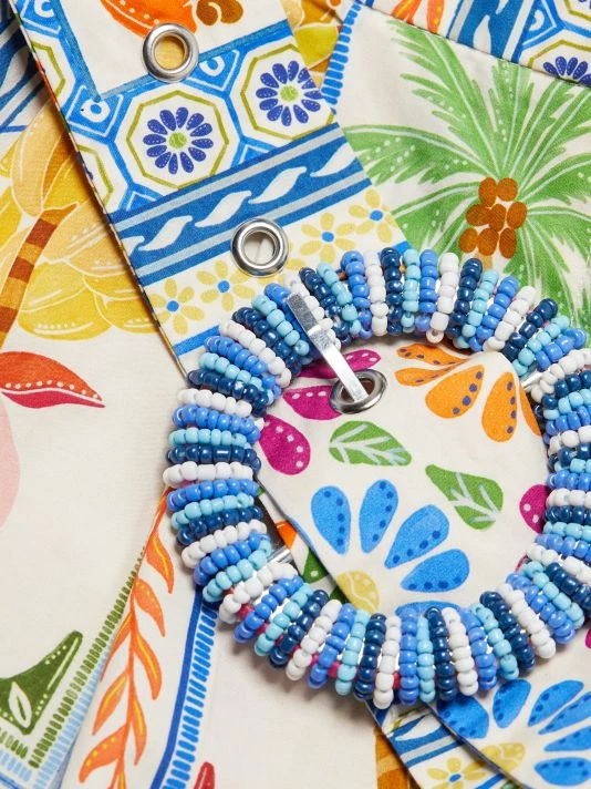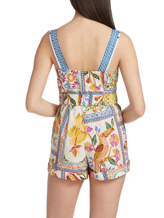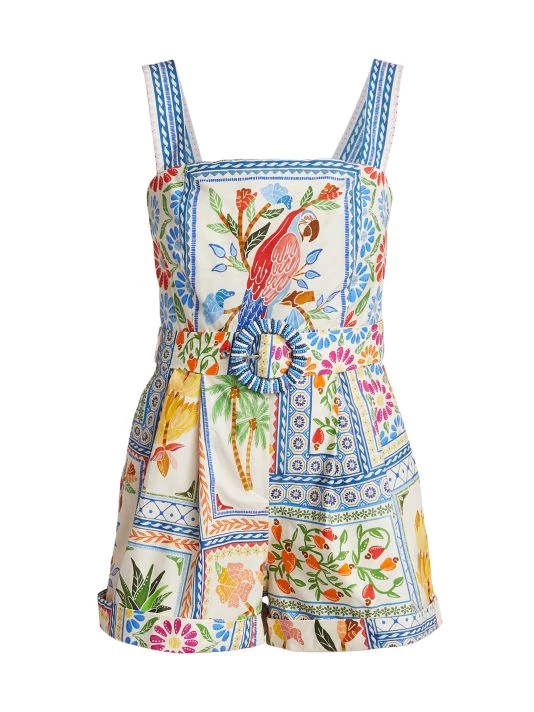 Decorated in a vibrant Tropical Tile print, Farm Rio’s romper flaunts a structured squareneck. This mini piece is cinched with a matching circular buckle belt.