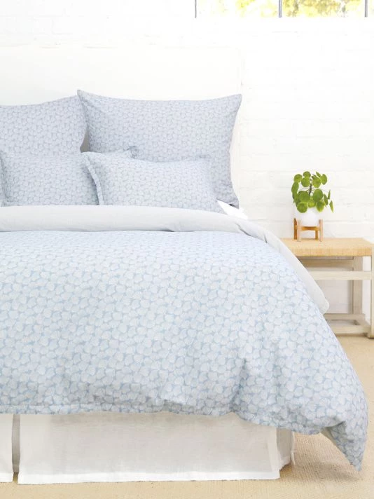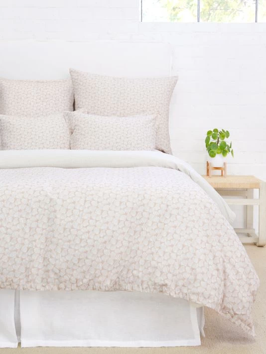 Designed to embody an elegant, lived in look, Pom Pom at Home’s double-sided duvet flaunts natural pinstripes and a stamped shell pattern.