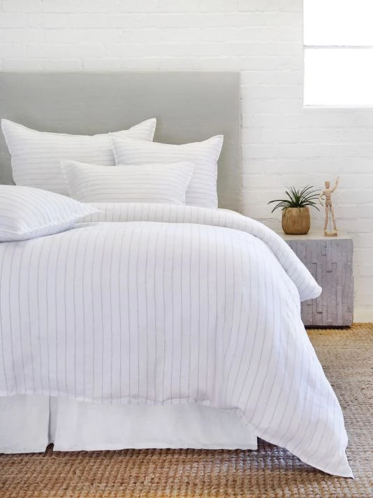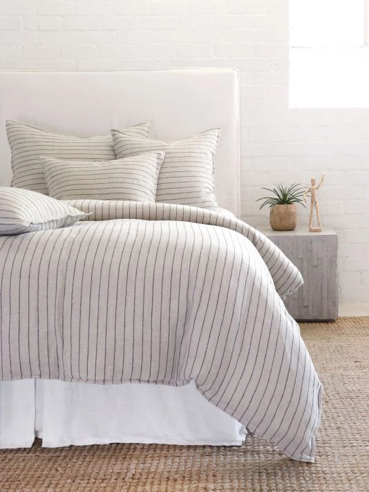 From the Blake Collection. The Blake linen collection features an interwoven stripe texture, giving a modern refresh to a traditional stripe. The duvet and shams are hand-loomed by artisans and the linen is washed for a relaxed lived-in look. The melange of textures within this woven bedding elevates any space to a sophisticated, yet relaxing retreat.