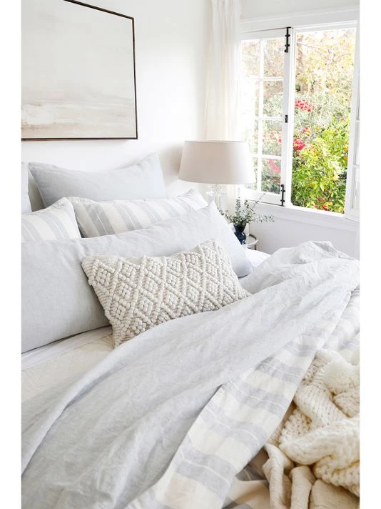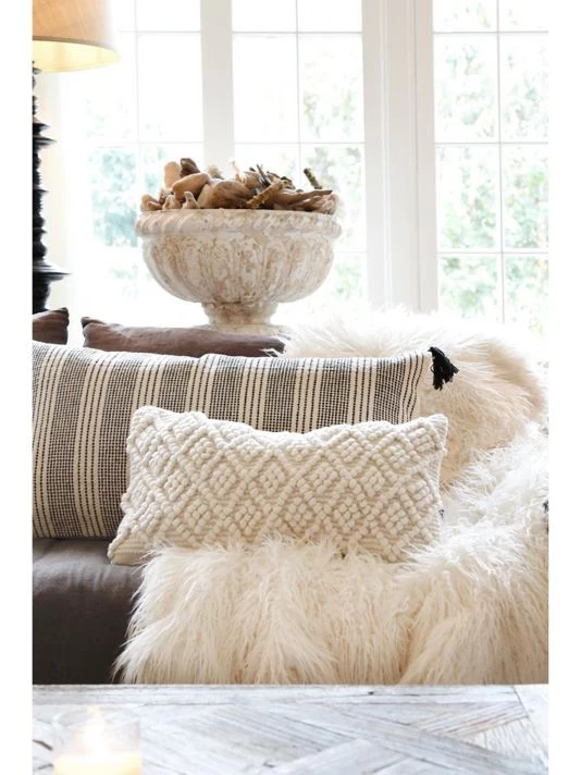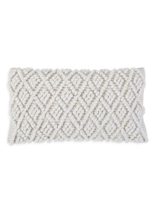 The Coco is a handwoven pillow loomed with soft ivory looped nubs in diamond patterns.