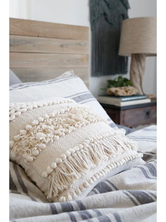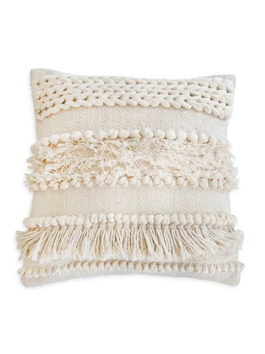 Hand-loomed tassels, braids, and pom-poms adorn this square pillow bringing an earthy and textured feel to the home.