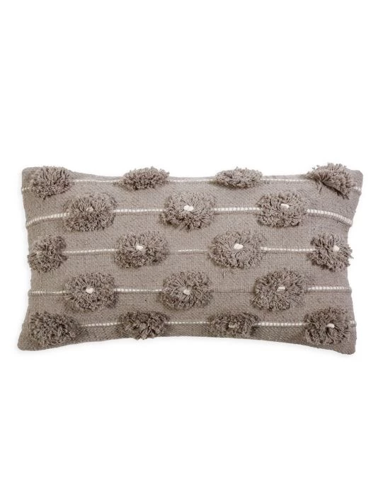 The Lola pillow is crafted of handwoven cotton and features knots, tassels, and woven stripes.