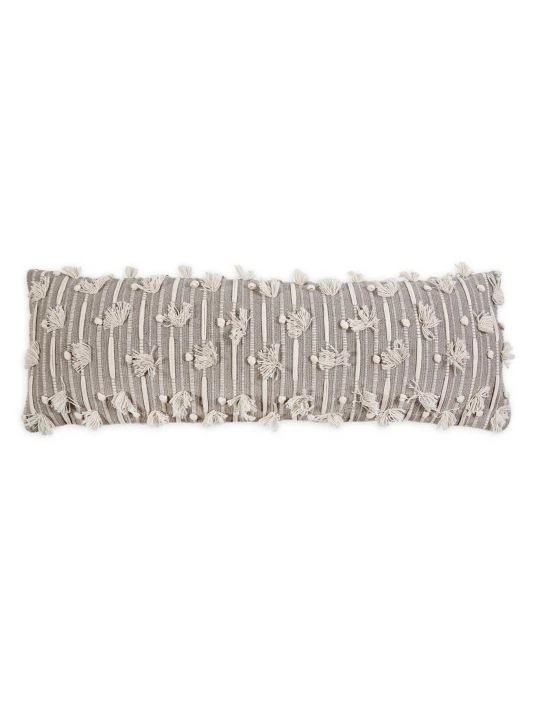 The Nora pillow is crafted of refined cotton with knots, tassels, and woven stripes.